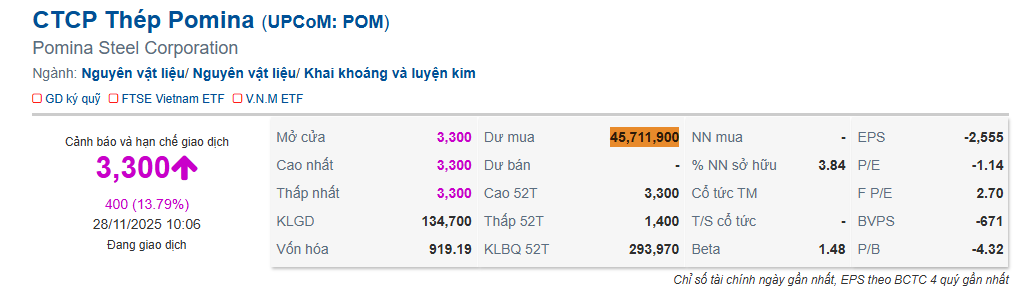 Mở cửa phiên 28/11, thị giá POM tăng kịch trần lên 3,300 đồng/cp, với dư mua trần hơn 45 triệu cp. Đây là phiên tăng trần thứ 4 liên tiếp của Pomina và với biên độ 15% của sàn UPCoM, đẩy giá cổ phiếu tăng 65% chỉ trong 4 phiên. Lưu ý rằng, cổ phiếu POM hiện đang trong diện hạn chế giao dịch và chỉ được giao dịch vào thứ Sáu hàng tuần.