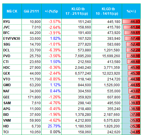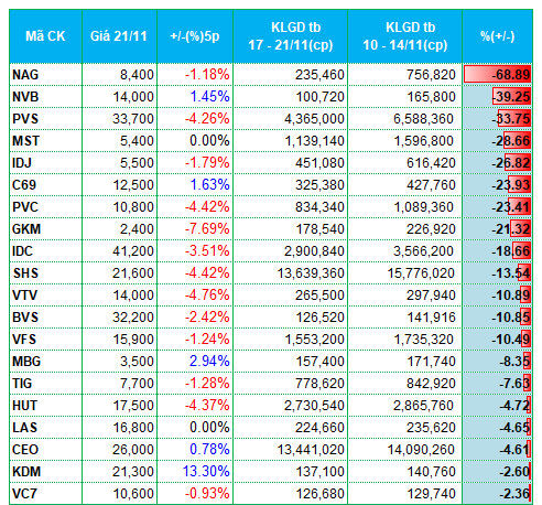 Ở chiều giảm, nhóm thiết bị điện có nhiều đại diện góp mặt trong top cổ phiếu giảm thanh khoản mạnh nhất tuần qua. Trong đó, họ Gelex có sự góp mặt của GEXGEE, lần lượt giảm khối lượng giao dịch 45.3% và gần 41% so với tuần trước. Cổ phiếu SAM cũng ghi nhận khối lượng giảm gần 40%. Ở sàn HNX, hai cổ phiếu thiết bị điện là NAG, MBG cũng nằm trong top giảm mạnh thanh khoản.