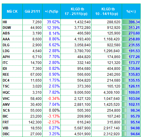 * Danh sách các mã tăng, giảm thanh khoản nhiều nhất xét đến khối lượng giao dịch bình quân trên 100,000 đơn vị/phiên.