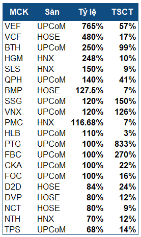 Không áp đảo như UPCoM, nhưng 2 sàn HOSE và HNX vẫn đóng góp một số cái tên ấn tượng với tỷ lệ trên 100%.
