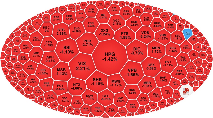 Ngược lại, top 10 giảm giá, sau khi bỏ qua 2 cổ phiếu họ Bamboo Capital - BCG và TCD - do các lùm xùm pháp lý, còn có các cái tên sừng sỏ với nội tại tốt là FPT (-27%), DGC (-19%), SZC (-18%)…