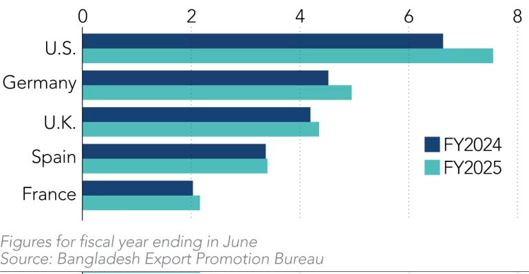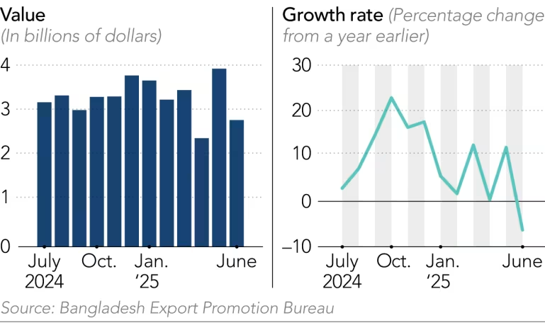 Bắt đầu từ tháng 9 năm ngoái, nhập khẩu quần áo của Mỹ từ Bangladesh tăng với tốc độ hai chữ số, có tháng tăng tới 46%, đưa quốc gia Nam Á này ngang bằng với Trung Quốc – quốc gia đẫn đầu lâu năm trên thị trường Mỹ. Nhưng thông báo kế hoạch thuế quan đối ứng toàn cầu của ông Trump vào tháng 4 đã nhanh chóng kéo giảm xuất khẩu của Bangladesh.