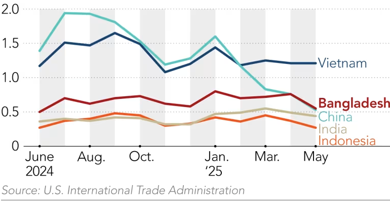 Vào tháng 5, nhập khẩu quần áo của Mỹ từ Bangladesh giảm 8.2% so với cùng kỳ năm trước. Dữ liệu tháng 6 cho thấy mức giảm đã tăng tốc vượt 10%, và có thể còn tệ hơn vào tháng 7 khi các nhà máy may Việt Nam có vẻ sẽ có lợi thế thuế quan lớn.