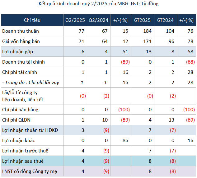 Lũy kế 6 tháng đầu năm 2025, MBG ghi nhận lãi ròng 8 tỷ đồng, đảo chiều so với khoản lỗ cùng kỳ. Kết quả này đến từ doanh thu thuần nửa đầu năm đạt 184 tỷ đồng, tăng 76%, trong khi chi phí quản lý giảm 69% còn 4 tỷ đồng.
