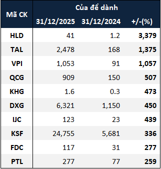 Theo thống kê từ VietstockFinance, trong 47 doanh nghiệp bất động sản tăng của để dành (Người mua trả tiền trước + Doanh thu chưa thực hiện) năm 2025, có đến 15 doanh nghiệp tăng bằng lần.