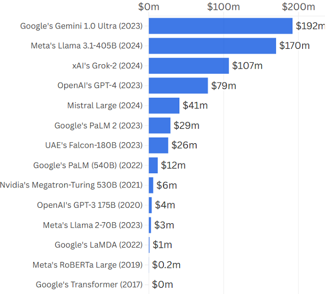 Viện AI của Đại học Stanford gần đây đã công bố một báo cáo cho thấy chi phí ước tính để xây dựng một số mô hình AI tiêu biểu từ năm 2019 đến năm 2024. Ví dụ, GPT-4 của OpenAI tốn 79 triệu USD để xây dựng vào năm 2023, trong khi Gemini 1.0 Ultra của Google là 192 triệu USD. Llama 3.1-405B của Meta tốn 170 triệu USD để xây dựng vào năm 2024.