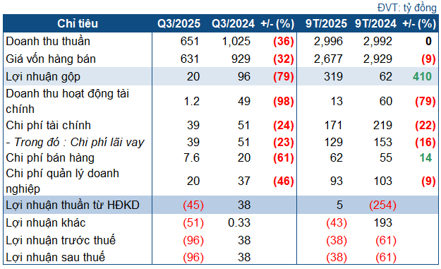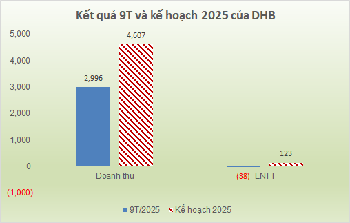 Khoản lỗ bất ngờ trong quý 3 trở thành điểm đen cho bức tranh lũy kế của DHB. Sau 9 tháng đầu năm, DHB ghi nhận doanh thu thuần gần như đi ngang so với cùng kỳ, đạt khoảng 3 ngàn tỷ đồng, từ có lãi bán niên thành lỗ sau thuế 38 tỷ đồng sau 9 tháng, nhưng vẫn giảm đáng kể so với khoản lỗ 61 tỷ đồng cùng kỳ. Doanh nghiệp thực hiện được 65% kế hoạch doanh thu, và còn cách xa mục tiêu lãi trước thuế 123 tỷ đồng được ĐHĐCĐ 2025 giao phó.
