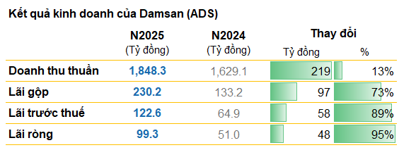 Lũy kế cả năm 2025, Damsan ghi nhận doanh thu hơn 1,848 tỷ đồng, tăng 13% so với năm trước. Biên lãi gộp lần đầu vượt mốc 12%, đạt gần 12.5%, cao nhất trong lịch sử hoạt động.