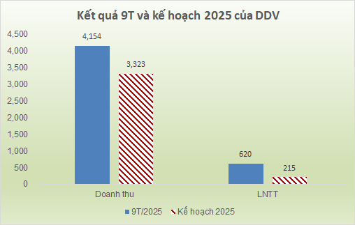 Kết quả bùng nổ tại quý 3 giúp bức tranh lũy kế của DDV rực sáng. Sau 9 tháng đầu năm, Doanh nghiệp ghi nhận doanh thu thuần gần 4.2 ngàn tỷ đồng, tăng 68%; lãi sau thuế đạt 496 tỷ đồng, gấp 4.5 lần cùng kỳ. So với kế hoạch được ĐHĐCĐ 2025 thông qua, Doanh nghiệp vượt xa các chỉ tiêu đề ra, với mức vượt 25% doanh thu và 188% mục tiêu lãi trước thuế.