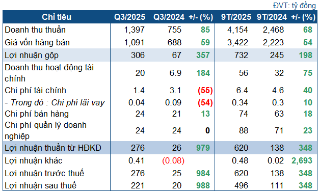 Hoạt động tài chính cũng đóng góp tích cực vào kết quả kinh doanh quý 3, với doanh thu tài chính đạt gần 20 tỷ đồng, gấp gần 3 lần với cùng kỳ, chủ yếu nhờ lãi tiền gửi tăng mạnh và chênh lệch tỷ giá. Chiều ngược lại, chi phí tài chính giảm mạnh 55% xuống còn 1.4 tỷ đồng, nhờ giảm lỗ chênh lệch tỷ giá.