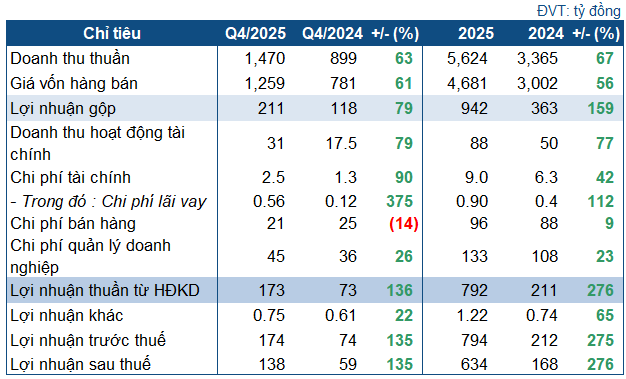 Khép lại quý 4/2025, DDV ghi nhận doanh thu thuần gần 1.5 ngàn tỷ đồng, tăng vọt 63% so với cùng kỳ năm trước. Động lực tăng trưởng đến từ giá bán bình quân trong kỳ đạt 17.7 triệu đồng/tấn, tăng 3.5 triệu đồng/tấn so với cùng kỳ, tương đương 25%. Bên cạnh đó, Doanh nghiệp ghi nhận sự đóng góp tích cực từ doanh thu kinh doanh hóa chất.