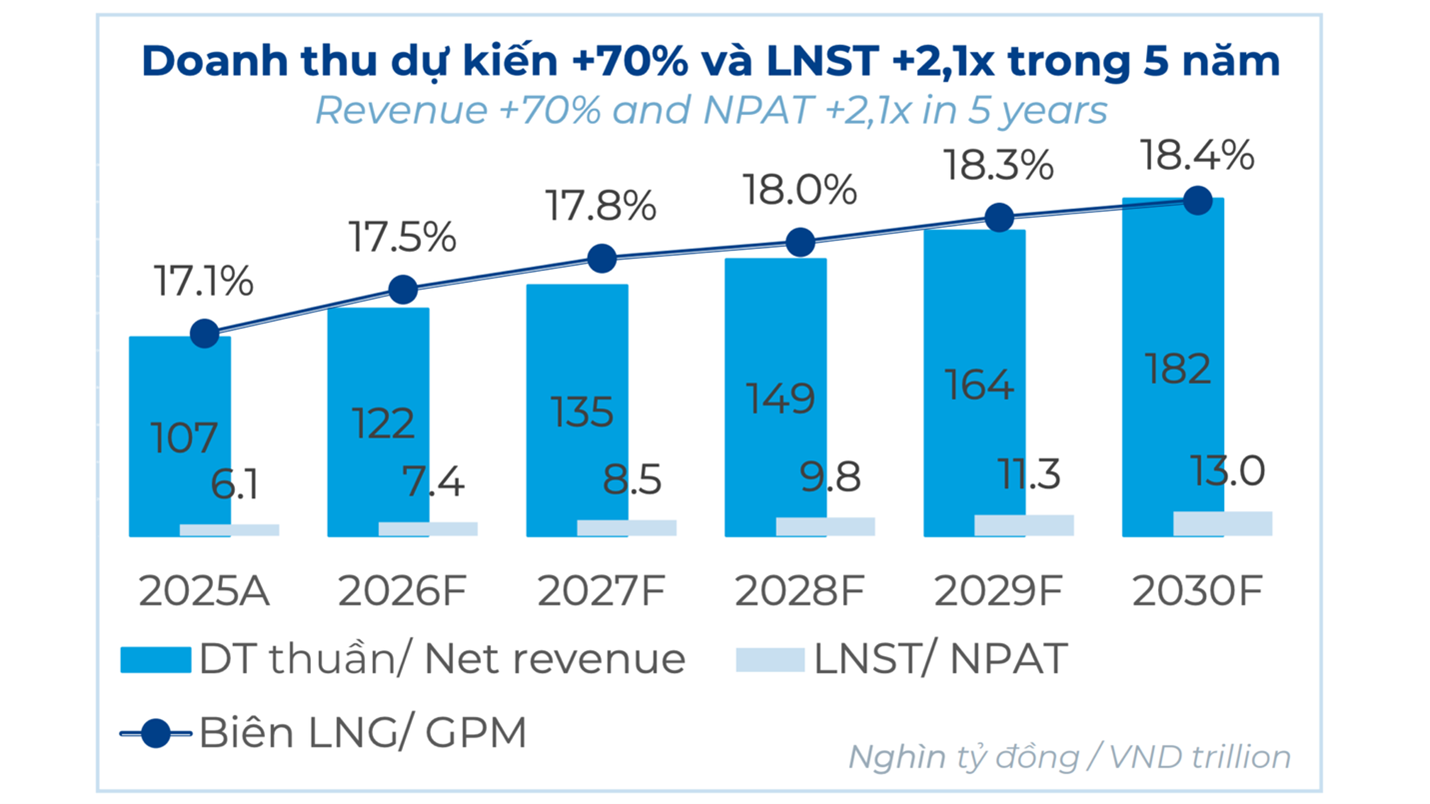 Tốc độ tăng trưởng lợi nhuận (CAGR 16%) bắt buộc phải cao hơn tốc độ tăng trưởng doanh thu (CAGR 11%). Biên lợi nhuận gộp hướng tới 18.4% vào năm 2030. Cùng với đó, công ty cam kết tỷ lệ chi trả cổ tức tối thiểu 50%.