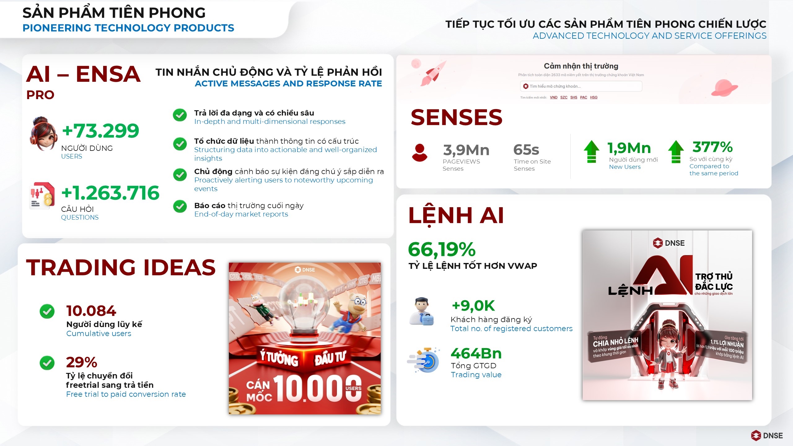 Trading Ideas - Ý tưởng đầu tư là công cụ đồng hành lý tưởng cho người nhà đầu tư mới gia nhập thị trường, còn ít kinh nghiệm. Năm 2025 ghi nhận tổng số người dùng lũy kế đạt hơn 10,000 users sau 10 tháng golive. Sản phẩm duy trì tỷ lệ thắng đạt 65.6 %, cụ thể tổng số khuyến nghị: 370 deals, trong đó 240 deals có lãi. Hiệu suất đầu tư cả danh mục khuyến nghị: 56% (từ 2024), và đạt 21% trong năm 2025.