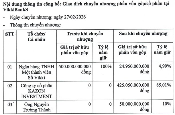Cụ thể, trong ngày 27/02, Ngân hàng TNHH MTV Số Vikki (Vikki Bank) - đơn vị góp 100% vốn VikkiBankS, quy mô 500 tỷ đồng - đã chuyển nhượng đến 85.01% vốn cho CTCP Kazon Investment và 10% cho ông Nguyễn Trường Thành. Như vậy, Vikki Bank không còn giữ vai trò công ty mẹ của VikkiBankS, thay thế bởi Kazon Investment.