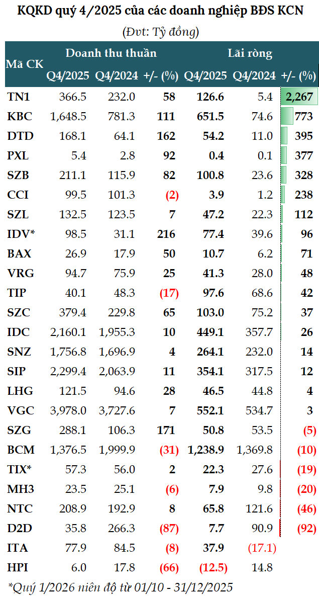 Trong nhóm dẫn dắt, Tổng Công ty Phát triển Đô thị Kinh Bắc – CTCP (HOSE: KBC) khép lại năm 2025 với lợi nhuận ròng 2,147 tỷ đồng, gấp 5.6 lần năm trước nhờ doanh thu KCN bứt phá. Riêng quý 4 mang về gần 652 tỷ đồng, gấp hơn 21 lần cùng kỳ. Dù vậy, so với kế hoạch tham vọng đặt ra cho cả năm, KBC mới hoàn thành khoảng 70% mục tiêu.