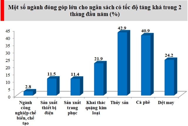 Lũy kế 2 tháng, thu ngân sách nhà nước do cơ quan thuế quản lý ước đạt 276.664 tỷ đồng, tăng 7,7% so với cùng kỳ năm 2021. Hàng loạt ngành đóng góp lớn cho ngân sách có tốc độ tăng thu vượt bậc so với cùng kỳ như thuỷ sản tăng 43%; cà phê tăng 41%...