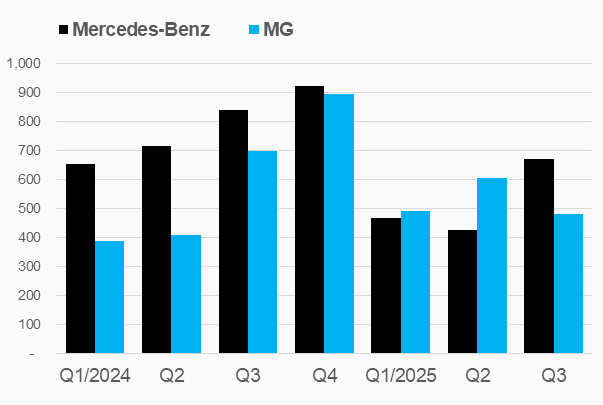 CTCP Dịch vụ Ô tô Hàng xanh (Haxaco, HOSE: HAX) vừa công bố báo cáo tài chính hợp nhất quý 3/2025 với kết quả ảm đạm. Doanh thu thuần của trùm phân phối xe đạt 1.15 ngàn tỷ đồng, giảm 25% so với cùng kỳ năm trước. Cả 2 mảng kinh doanh xe sang Mercedes-Benz lẫn xe phổ thông MG đều chứng kiến doanh thu giảm 2 chữ số. Theo đó, Haxaco lỗ ròng hơn 28 tỷ đồng, trong khi cùng kỳ lãi ròng gần 62 tỷ đồng.