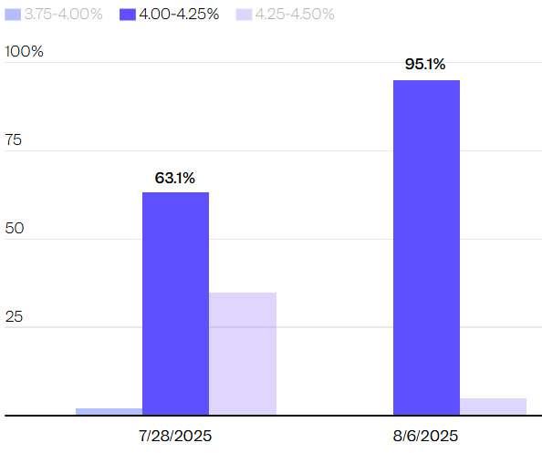 Theo công cụ FedWatch của CME, thị trường đang định giá xác suất lên tới 95.1% rằng Fed sẽ thực hiện một đợt cắt giảm lãi suất 25 điểm cơ bản tại cuộc họp chính sách tiếp theo.