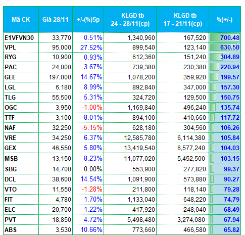 Dòng tiền thận trọng dẫn tới việc không nhiều nhóm ngành hút tiền nổi bật trong tuần vừa qua. Một số mã chứng khoán riêng lẻ hút tiền mạnh như E1VFVN30 tăng thanh khoản hơn 700%, đạt 1.3 triệu đơn vị/phiên. VPL cũng có thanh khoản tăng tới hơn 630%, đạt gần 900 ngàn đơn vị/phiên.