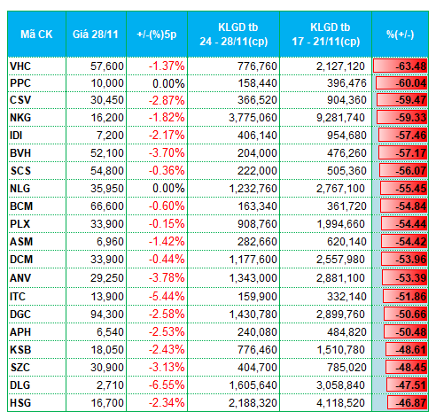 Ở chiều giảm, nhóm thủy sản là một trong số các nhóm bị rút tiền mạnh. VHC, IDI, ASM, ANV ghi nhận mức giảm khối lượng giao dịch từ 50 - 60%. Một số cổ phiếu thực phẩm cũng chịu chung cảnh ngộ. BNA, CTP giảm thanh khoản trong khoảng 60%.