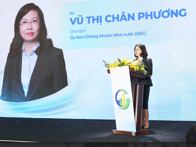 Bà Vũ Thị Chân Phương - Chủ tịch Ủy ban Chứng khoán Nhà nước phát biểu tại AF8. Ảnh: BTC