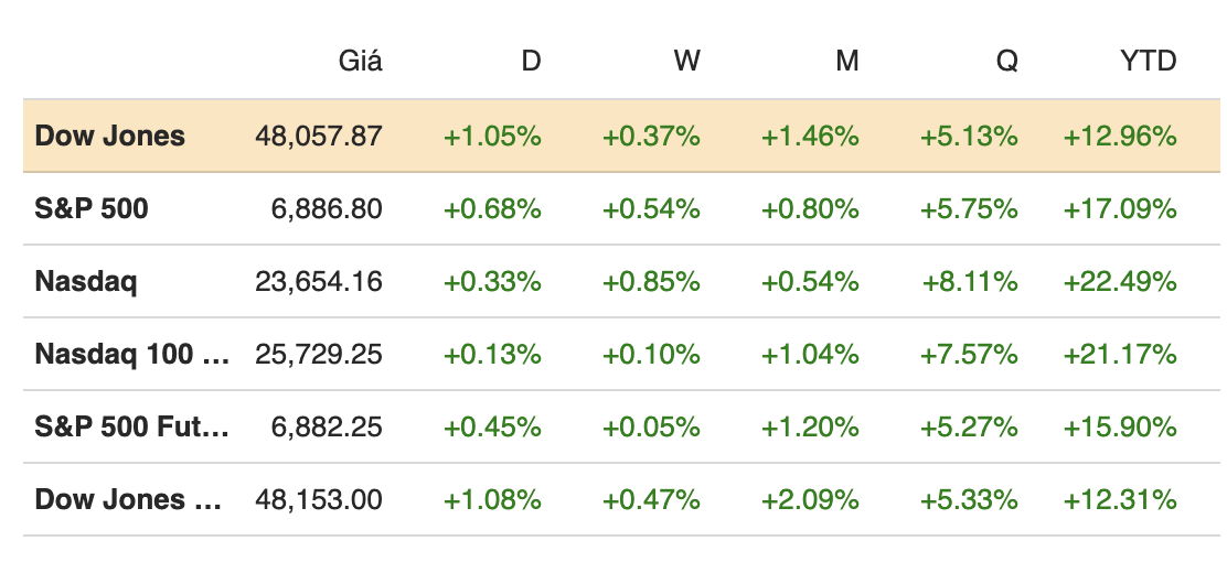 Khép phiên ngày 10/12, Dow Jones tăng 497,46 điểm (1.1%) lên 48,057.75 điểm. S&P 500 tăng 0.7% đóng cửa tại 6,886.68 điểm, trong phiên có lúc vượt mức đỉnh đóng cửa trước đó là 6,890.89 điểm. Nasdaq Composite tăng 0.3% lên 23,654.16 điểm.
