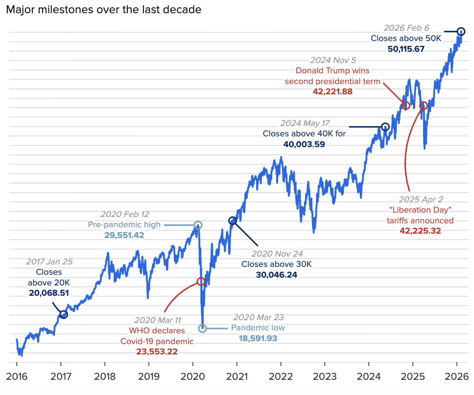 Khép phiên ngày 06/02, chỉ số Dow Jones tăng 1,206.95 điểm, tương đương 2.47%, chốt phiên tại 50,115.67 điểm. Đây là lần đầu tiên Dow Jones vượt mốc 50,000 điểm khi đóng cửa. S&P 500 tăng 1.97% lên 6,932.30 điểm, còn Nasdaq Composite leo 2.18% lên 23,031.21 điểm. Với diễn biến này, S&P 500 đã quay trở lại sắc xanh tính từ đầu năm 2026.