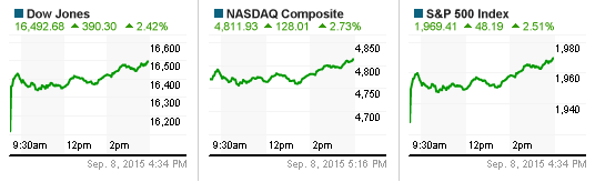 Kết thúc phiên giao dịch ngày thứ Ba, chỉ số Dow Jones nhảy vọt 390.3 điểm (tương ứng 2.42%) lên 16,492.68 điểm, chỉ số S&P 500 tăng mạnh 48.19 điểm (tương ứng 2.51%) lên 1,969.41 điểm và chỉ số Nasdaq Composite cộng 128.01 điểm (tương ứng 2.73%) lên 4,811.93 điểm.