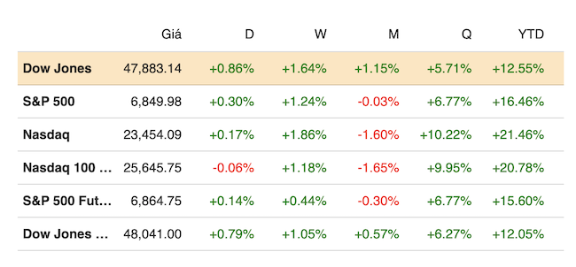 Kết thúc phiên giao dịch ngày 03/12, chỉ số Dow Jones tăng 408.44 điểm (tương đương 0.86%) lên 47,882.90 điểm. Chỉ số S&P 500 tiến 0.30% lên 6,849.72 điểm, còn chỉ số Nasdaq Composite nhích 0.17% lên 23,454.09 điểm.