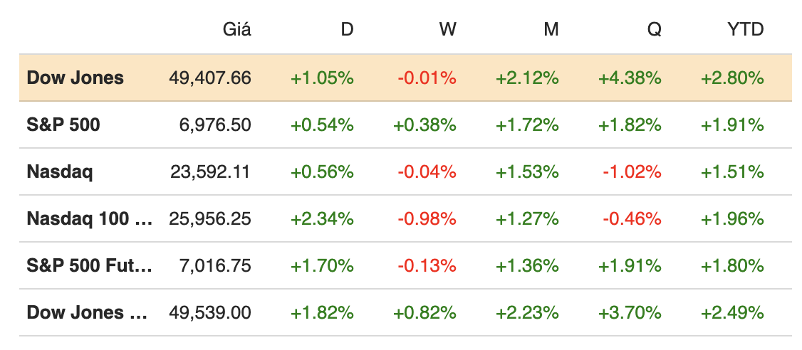 Khép phiên ngày 02/02, chỉ số Dow Jones tăng 515.19 điểm, tương đương 1.05%, lên 49,407.66 điểm. S&P 500 tăng 0.54% và đóng cửa tại 6,976.44 điểm, trong khi Nasdaq Composite tăng 0.56% lên 23,592.11 điểm.