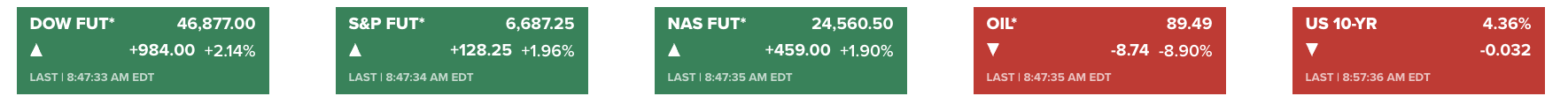 Dow Jones tương lai tăng gần 1,000 điểm, dầu giảm 10%, vàng lên gần 4,500 USD