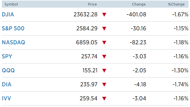 Tính tới lúc 20h50 ngày thứ Tư (04/04 – giờ Việt Nam), chỉ số Dow Jones rớt 401.08 điểm (tương ứng 1.67%), trong đó cổ phiếu Boeing và Caterpillar dẫn đầu đà lao dốc. Bên cạnh đó, chỉ số S&P 500 lùi 30.15 điểm (tương ứng 1.15%), với năng lượng và công nghiệp là hai lĩnh vực có thành quả tồi tệ nhất. Còn Nasdaq Composite hạ 82.23 điểm (tương ứng 1.18%).