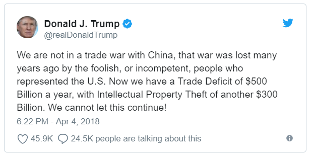 Giữa lúc căng thẳng dâng cao, Tổng thống Mỹ Donald Trump viết trên mạng xã hội Twitter rằng: “Chúng ta không phải đang trong một cuộc chiến thương mại với Trung Quốc. Cuộc chiến thương mại đó chúng ta đã thua từ nhiều năm về trước”.
