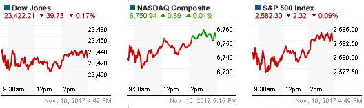 Kết thúc phiên giao dịch ngày thứ Sáu, chỉ số Dow Jones lùi 0.17% xuống 23,422.21 điểm, chỉ số S&P 500 hạ 0.09% xuống 2,582.3 điểm, trong khi chỉ số Nasdaq Composite nhích 0.01% lên 6,750.94 điểm.
