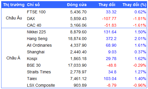 Diễn biến của các chỉ số chứng khoán chính tại châu Á và châu Âu ngày 17/10: