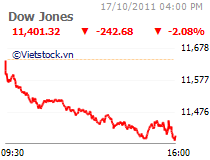 Kết thúc ngày giao dịch, chỉ số Dow Jones sụt 246.58 điểm (2.12%) xuống 11,397.91 điểm, chỉ số S&P 500 hạ 23.72 điểm (1.94%) xuống 1,200.86 điểm, chỉ số Nasdaq Composite trượt 52.93 điểm (1.98%) xuống 2,614.92 điểm.