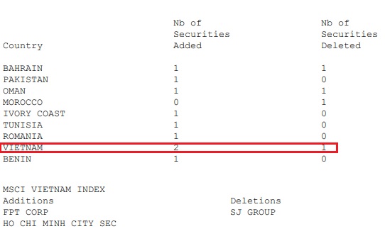Cụ thể, MSCI Frontier Market Index đã thêm vào 9 mã cổ phiếu, trong đó Việt Nam đóng góp 2 đại diện là FPT và HCM. Chiều ngược lại, rổ chỉ số loại 3 mã, với 1 mã từ Việt Nam là SJS.