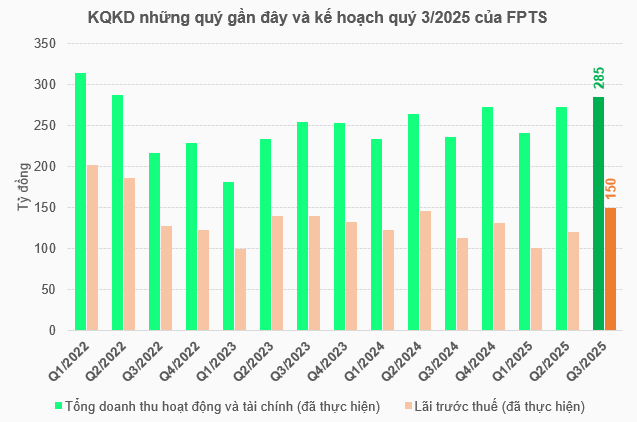 Về kế hoạch kinh doanh quý 3/2025, FPTS kỳ vọng mang về tổng doanh thu hoạt động và tài chính (đã thực hiện) 285 tỷ đồng và lãi trước thuế (đã thực hiện) 150 tỷ đồng, lần lượt tăng 21% và 33% so với kết quả quý 3/2024.