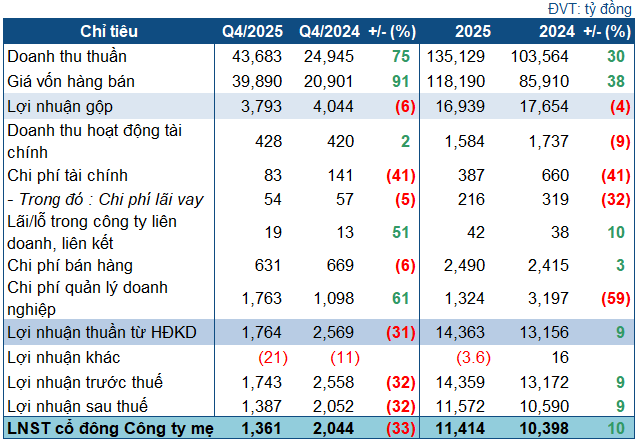 Quý 4/2025, doanh thu thuần của GAS đạt gần 44 ngàn tỷ đồng, tăng vọt 75% so với cùng kỳ năm trước. Tuy nhiên, giá vốn hàng bán cũng tăng mạnh lên gần 39.9 ngàn tỷ đồng, khiến lợi nhuận gộp bị bào mòn, còn gần 3.8 ngàn tỷ đồng (giảm 6%).