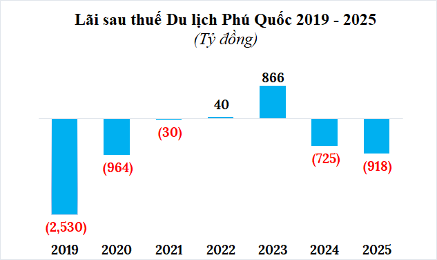 CTCP Đầu tư và Phát triển Du lịch Phú Quốc (DPQC) công bố thông tin tài chính năm 2025 gửi Sở Giao dịch Chứng khoán Hà Nội (HNX), với kết quả tiếp tục thua lỗ gần 918 tỷ đồng, năm trước lỗ hơn 725 tỷ đồng. Qua đó, nâng tổng lỗ lũy kế lên hơn 5,857 tỷ đồng.