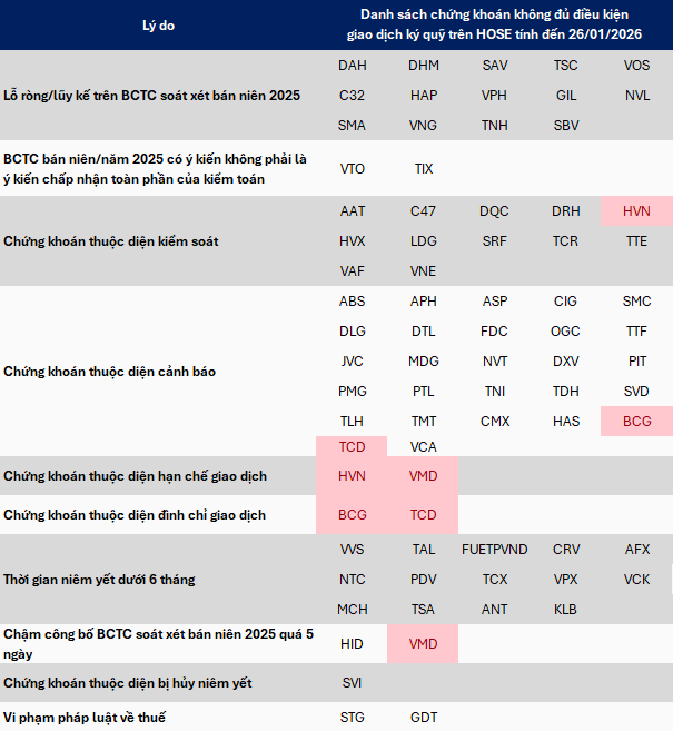 Danh sách cổ phiếu bị cắt margin được HOSE công bố và liên tục cập nhật các trường hợp ra và vào mới. Ngày 06/01/2026, HOSE đưa ra danh sách 70 cổ phiếu với nhiều lý do khác nhau, phần lớn do lỗ ròng/lũy kế trên BCTC soát xét bán niên 2025, thời gian niêm yết dưới 6 tháng hoặc rơi vào các diện kiểm soát, cảnh báo.