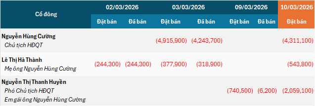 Cụ thể, Chủ tịch HĐQT Nguyễn Hùng Cường bị đặt bán giải chấp hơn 4.3 triệu cp, cùng với 2 thành viên khác trong gia đình gồm mẹ là Lê Thị Hà Thành với gần 544 ngàn cp và em gái Nguyễn Thị Thanh Huyền (Phó Chủ tịch HĐQT) gần 2.1 triệu cp. Tổng cộng, 3 thành viên gia đình Chủ tịch bị bán hơn 6.9 triệu cp.