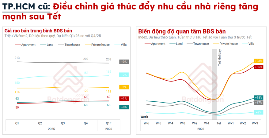 Tại TPHCM cũ, việc giá nhà riêng giảm nhẹ khoảng 2% đã góp phần kích thích nhu cầu quay trở lại, thể hiện qua lượng tìm kiếm tăng 23% ngay sau Tết; lượng tìm kiếm căn hộ cũng tăng 36%. Trong khi tại Hà Nội, chung cư tiếp tục là điểm sáng khi lượng tìm kiếm tăng khoảng 30%.