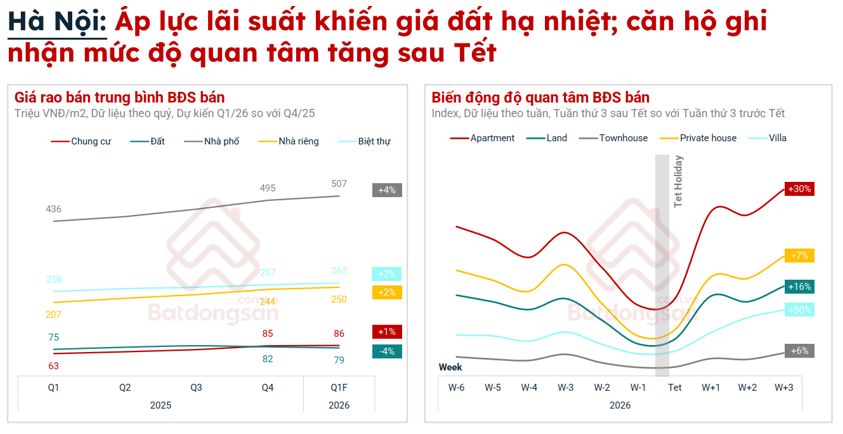 Dữ liệu Batdongsan.com.vn ghi nhận sự điều chỉnh nhẹ về giá ở một số loại hình. Tại Hà Nội, giá rao bán bình quân đất nền trong quý 1/2026 giảm 4% so với cuối năm 2025. Ở TPHCM cũ, giá nhà riêng giảm 2%.