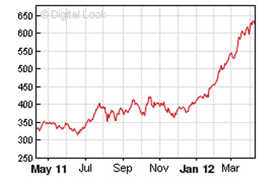Biểu đồ giá cổ phiếu Apple từ tháng 5-2011 đến 3-2012 |