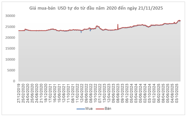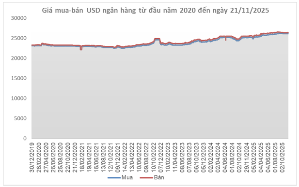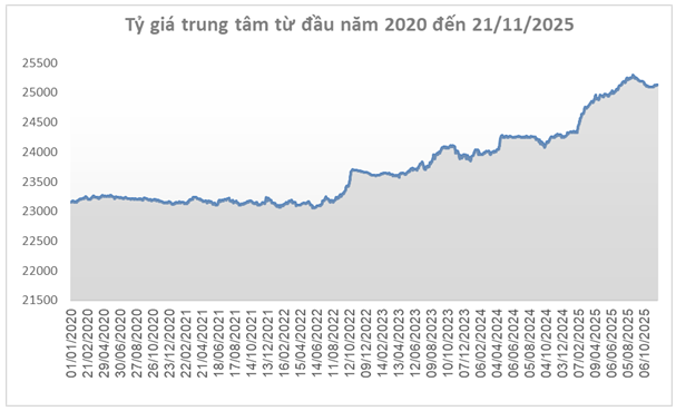Diễn biến quốc tế tác động lên tỷ giá trong nước. Ngày 21/11, tỷ giá trung tâm do Ngân hàng Nhà nước công bố đạt 25,136 đồng/USD, tăng 14 đồng so với cuối tuần trước và đánh dấu 3 tuần tăng liên tiếp. Với biên độ ±5%, tỷ giá tại các ngân hàng thương mại được phép dao động trong vùng 23,879 – 26,393 đồng/USD.