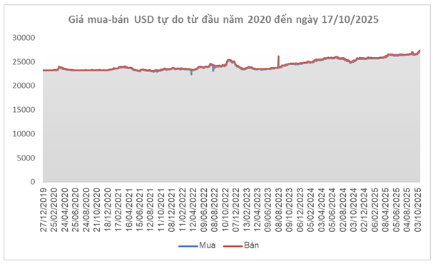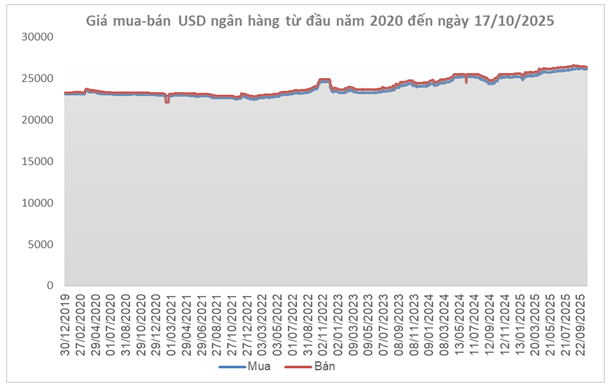 Tại Việt Nam, tỷ giá trung tâm ngày 17/10 được Ngân hàng Nhà nước công bố ở mức 25,101 đồng/USD, giảm 27 đồng so với cuối tuần trước, đánh dấu tuần giảm thứ 3 liên tiếp. Với biên độ ±5%, tỷ giá tại các ngân hàng thương mại được phép dao động trong khoảng 23,846 – 26,356 đồng/USD.