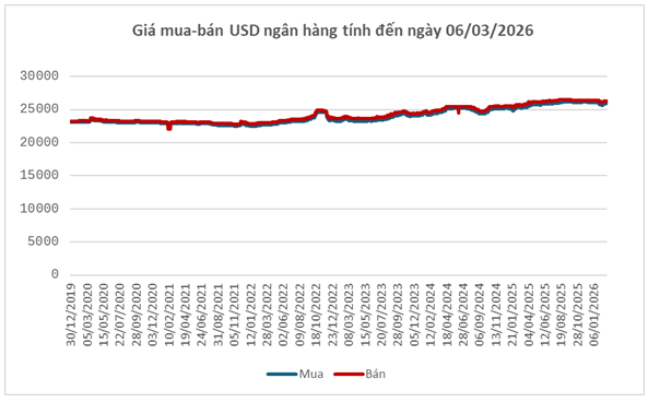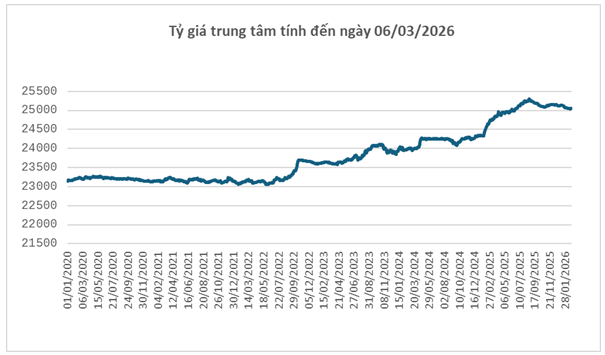 Trong nước, diễn biến tỷ giá USD/VND cũng chịu áp lực từ đà mạnh lên của USD. Ngày 06/03, Ngân hàng Nhà nước công bố tỷ giá trung tâm ở mức 25,057 đồng/USD, tăng 13 đồng so với cuối tuần 27/02. Với biên độ ±5%, tỷ giá tại các ngân hàng thương mại được phép dao động trong khoảng 23,804 – 26,310 đồng/USD.