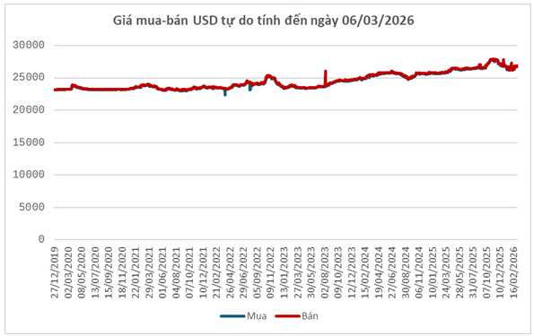 Trên thị trường tự do, tỷ giá USD cũng tăng đáng kể, lên mức 26,850 – 26,900 đồng/USD (mua vào – bán ra), tăng tương ứng 170 đồng ở chiều mua và 180 đồng ở chiều bán so với cuối tuần trước (27/02).