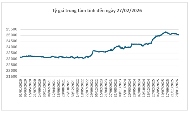 Trong nước, Ngân hàng Nhà nước công bố tỷ giá trung tâm ngày 27/02 ở mức 25,044 đồng/USD, giảm 5 đồng so với cuối tuần 13/02. Với biên độ ±5%, tỷ giá tại các ngân hàng thương mại được phép dao động trong khoảng 23,792 – 26,296 đồng/USD.